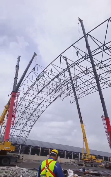 施工方式:起步架吊装,空中散装,建筑高度35米。